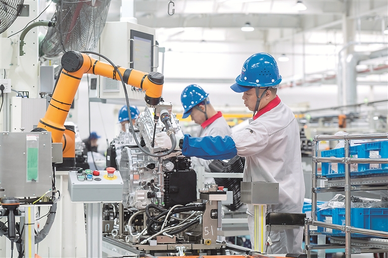 安徽省芜湖市立足本地发展实际,持续推动科技创新和产业创新深度融合,以汽车首位产业为龙头,带动多元产业协同发展。图为该市繁昌经济开发区某企业智能生产线上,工人在生产新能源汽车变速箱。图片来源:视觉中国