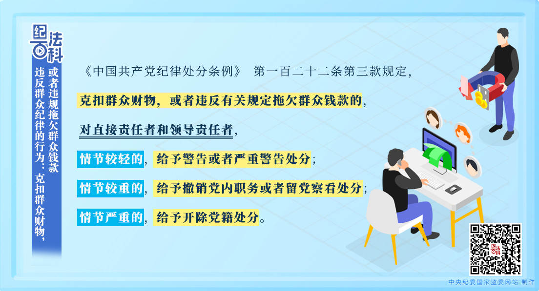 《中国共产党纪律处分条例》 第一百二十二条第三款规定,克扣群众财物,或者违反有关规定拖欠群众钱款的,对直接责任者和领导责任者,情节较轻的,给予警告或者严重警告处分;情节较重的,给予撤销党内职务或者留党察看处分;情节严重的,给予开除党籍处分。