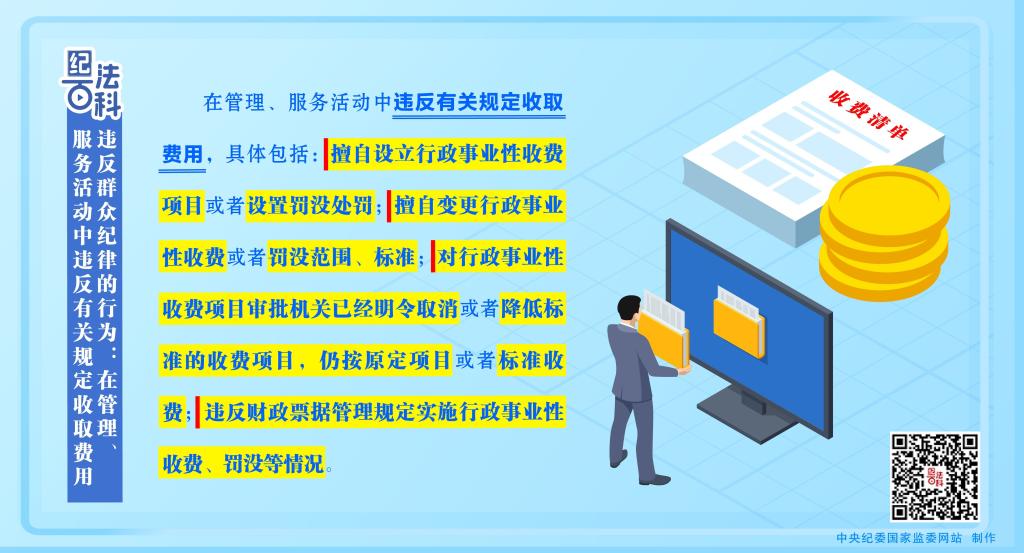 在管理、服务活动中违反有关规定收取费用,具体包括:擅自设立行政事业性收费项目或者设置罚没处罚;擅自变更行政事业性收费或者罚没范围、标准;对行政事业性收费项目审批机关已经明令取消或者降低标准的收费项目,仍按原定项目或者标准收费;违反财政票据管理规定实施行政事业性收费、罚没等情况。