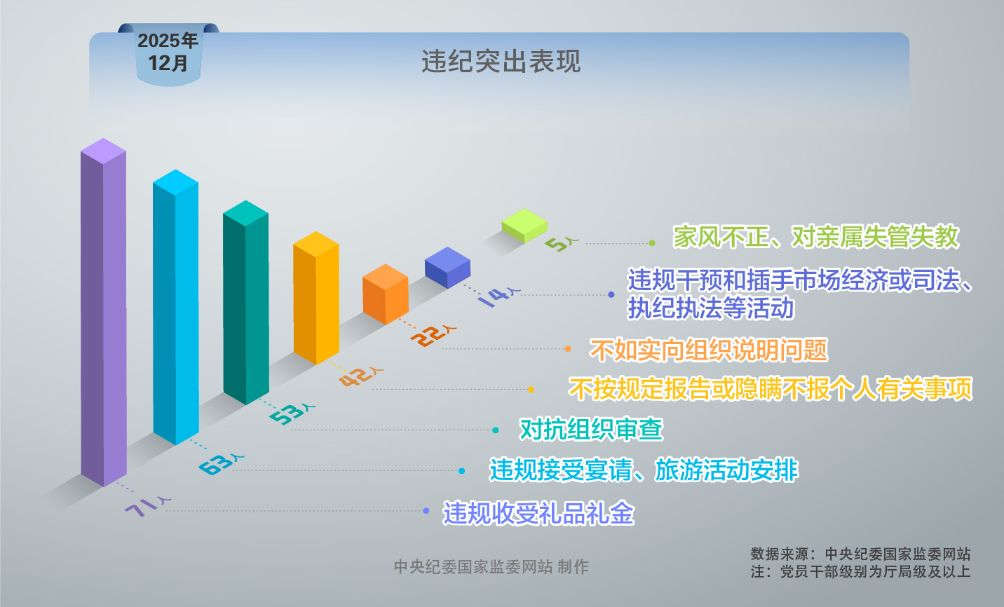 2025年12月,中央纪委国家监委网站通报的78名被处分党员、干部中,有53人存在对抗组织审查行为;不按规定报告或者隐瞒不报个人有关事项、不如实向组织说明问题的分别为42、22人;存在违规收受礼品、礼金或消费卡行为的多达71人;违规接受宴请、旅游活动安排63人。