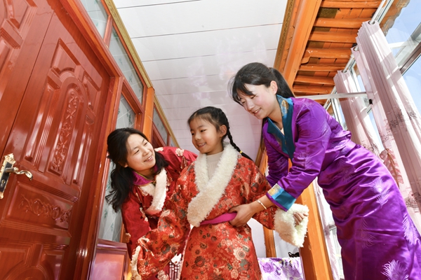 新春之际,青海省海东市互助土族自治县五十镇的一家小院里,妈妈和姐姐一起为妹妹换上崭新的藏服,幸福欢乐的笑容洋溢在每个人的脸上。(青海省纪委监委供 李娜 摄)