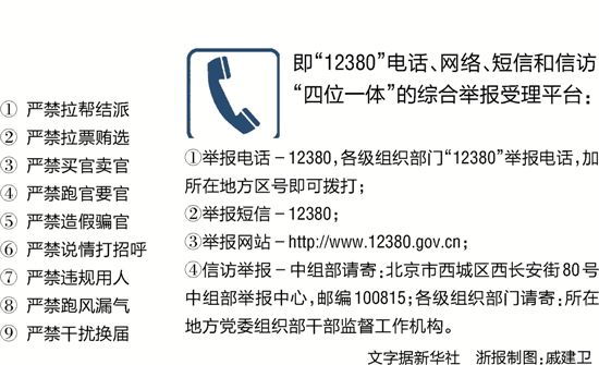 7月11日,市纪委召开区县纪委书记专题会议,传达贯彻中央和省市关于严明换届纪律有关要求,对严明换届纪律工作进行安排部署。市委常委、市纪委书记杨鑫在会上再次重申“九个严禁”换届纪律,要求以“零容忍”的态度正风肃纪。市纪委宣传部对中共中央纪委机关、中共中央组织部下发《关于加强换届风气监督的通知》(中组发〔2016〕1号),提出“九个严禁”换届纪律要求进行整理,连同举报方式一并刊出,以便广大干部群众熟悉了解。